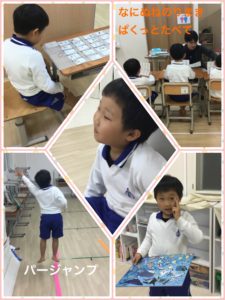 運動の時間にはウォーミングアップで、パージャンプ(脚を開いてジャンプ)と、先生が指示を出すと、手のひらをパーにして脚はグージャンプになってる咲翔くん😁