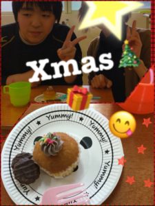 POMUではおやつの時間にミニカップケーキに生クリームとチョコをデコレーションしたおやつを皆で食べてクリスマス気分をあじわいました🤶🍰🎉